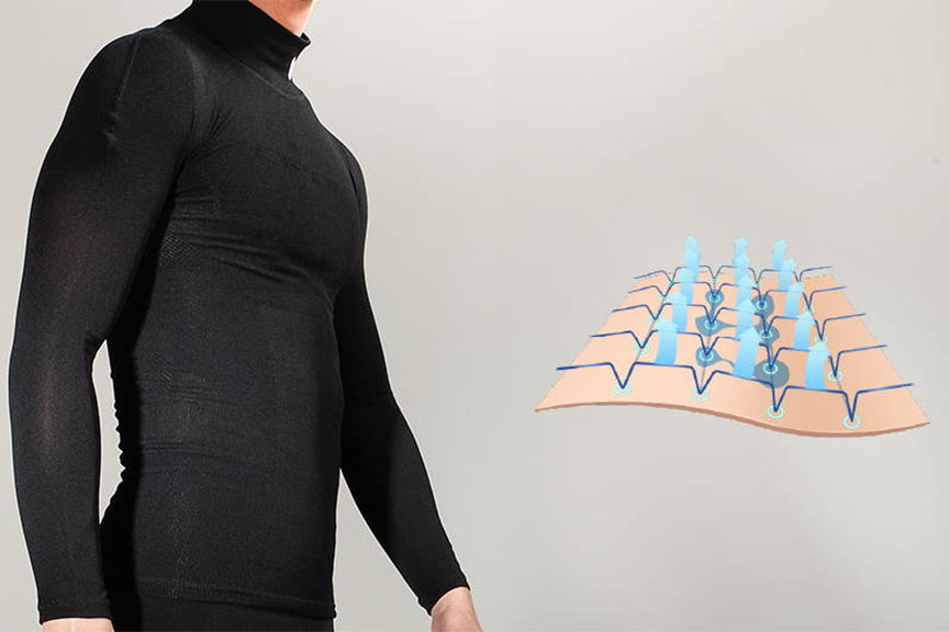 The tension can be freely adjusted for each part of the body. It is designed to stabilize joints and smooth muscle movement. The compression is highest in the parts farthest from the heart, and the compression is gentler as you get closer to the heart, promoting blood circulation. This so-called graduated compression can be achieved very naturally and smoothly.