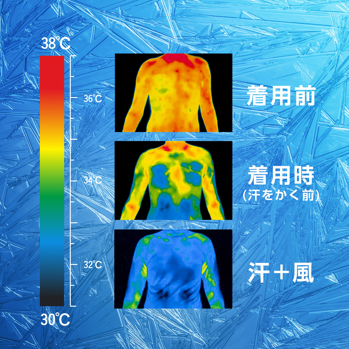 アイスメッシュを着用し、さらに汗をかくことで体温が下がり、クーリング効果が発揮されます。