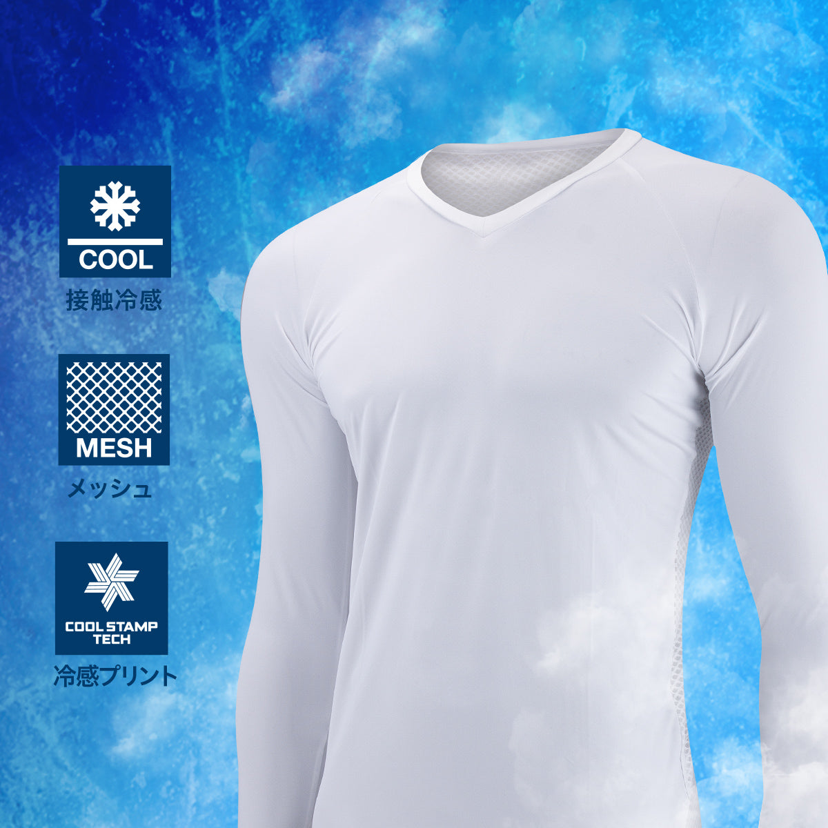独自の発想と技術から生まれた新感覚の冷却プリント「COOL STAMP TECH」を採用。刺激を利用することで脳が記憶する「記憶冷感効果」と、水分に反応して吸熱する「吸水冷却」のハイブリッドテクノロジー。