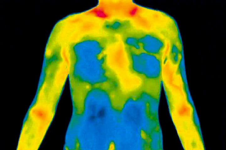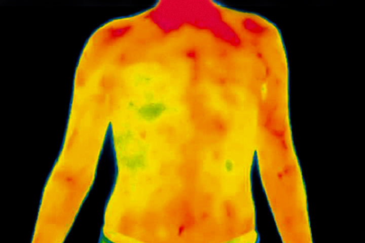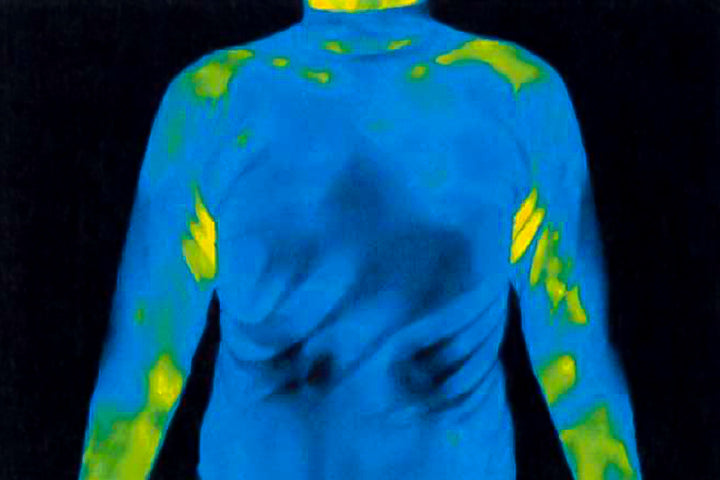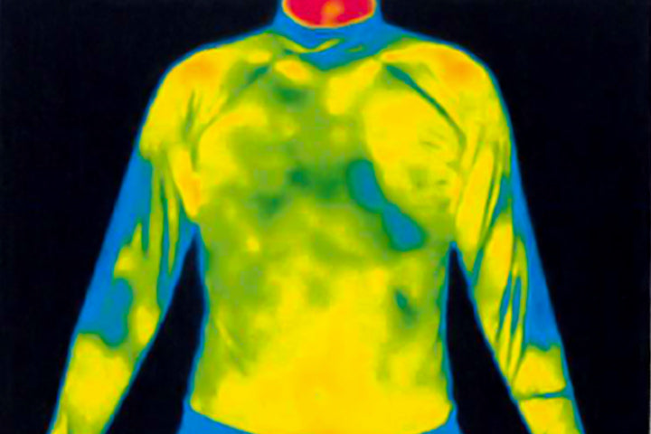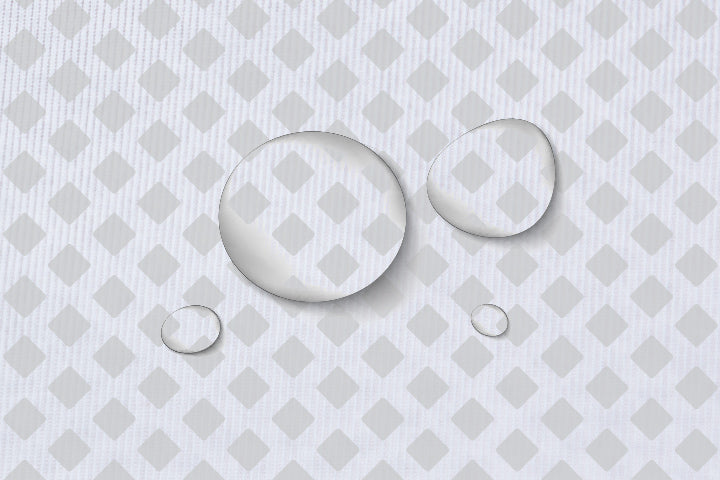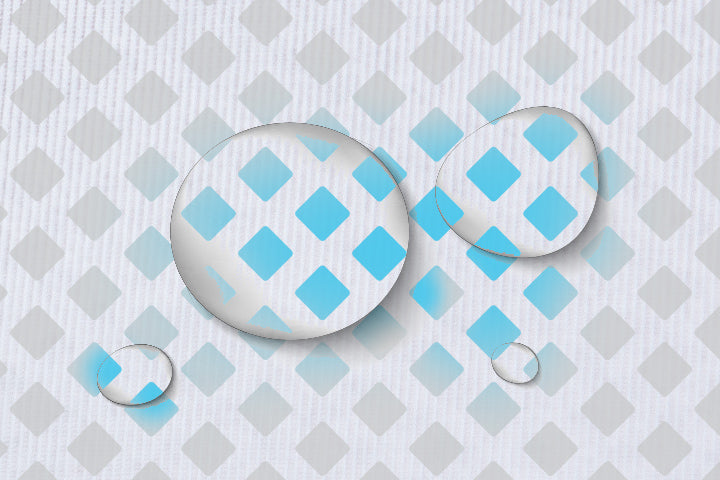 冷却プリントが水分(汗)を吸収すると、その吸熱特性により生地温度が下がり、冷感を付与。さらに風を受けることにより、冷感をブースト。驚きの冷感・クーリング効果を感じることができます。