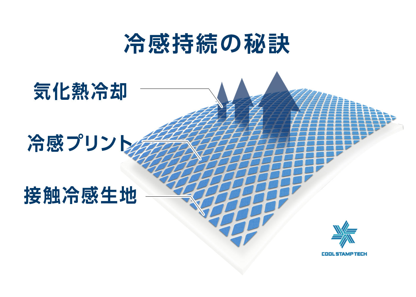 独自の発想と技術から生まれた新感覚の冷却プリント「COOL STAMP TECH」を採用。刺激を利用することで脳が記憶する「記憶冷感効果」と、水分に反応して吸熱する「吸水冷却」のハイブリッドテクノロジー。